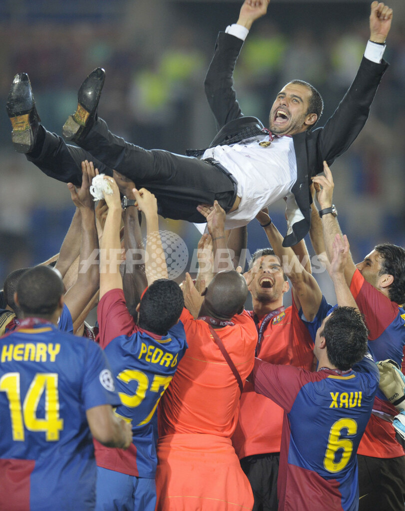 国内リーグ、国内カップ戦(スペイン国王杯(Copa del Rey 2008-09)に続きチャンピオンズリーグを制したバルセロナは、スペイン国内のクラブとして初の3冠を達成し、1999年にマンチェスター・ユナイテッドが成し遂げた偉業を再現した。(c)AFP/Barnaby Chesterman