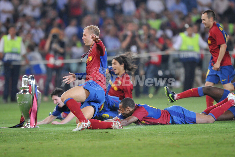 国内リーグ、国内カップ戦(スペイン国王杯(Copa del Rey 2008-09)に続きチャンピオンズリーグを制したバルセロナは、スペイン国内のクラブとして初の3冠を達成し、1999年にマンチェスター・ユナイテッドが成し遂げた偉業を再現した。(c)AFP/Barnaby Chesterman