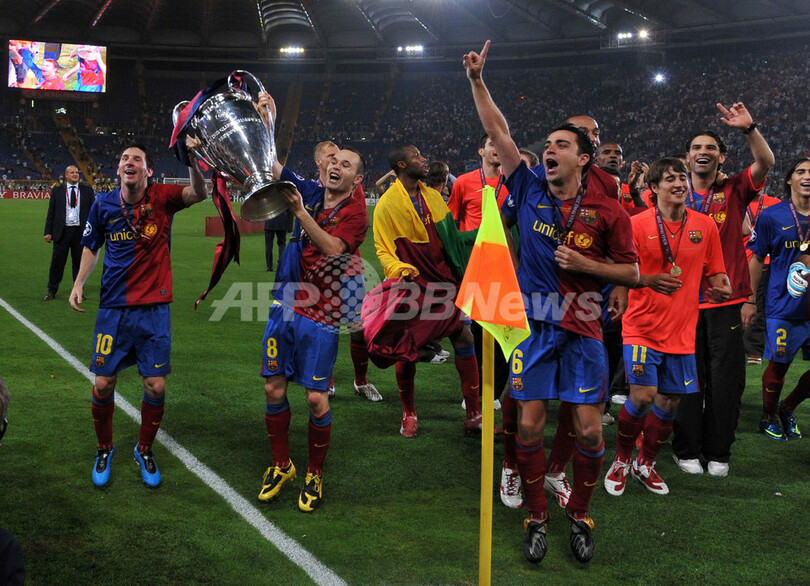 国内リーグ、国内カップ戦(スペイン国王杯(Copa del Rey 2008-09)に続きチャンピオンズリーグを制したバルセロナは、スペイン国内のクラブとして初の3冠を達成し、1999年にマンチェスター・ユナイテッドが成し遂げた偉業を再現した。(c)AFP/Barnaby Chesterman