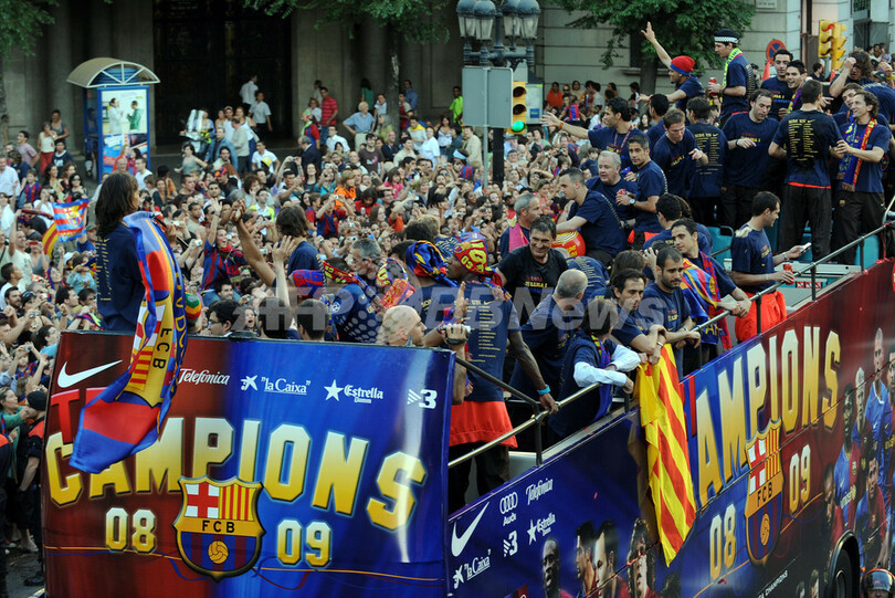 【5月29日 AFP】サッカー欧州チャンピオンズリーグ2008-09(UEFA Champions League 2008-09)を制したFCバルセロナ(FC Barcelona)が28日に優勝パレードを行い、駆けつけた数万人のファンが熱狂した。