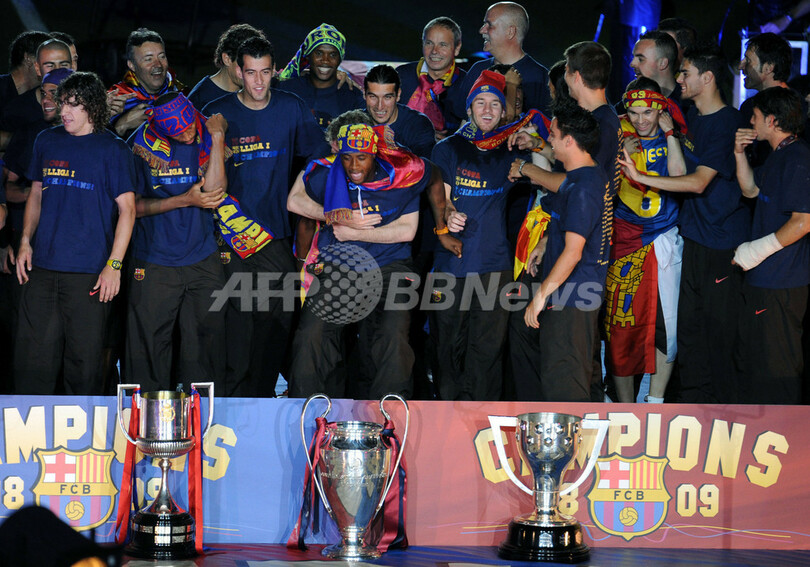 27日の決勝でマンチェスター・ユナイテッド(Manchester United)を2-0で下し、国内リーグ、国内カップ(スペイン国王杯(Copa del Rey 2008-09)に続き3冠を達成したリオネル・メッシ(Lionel Messi)、サミュエル・エトー(Samuel Eto’o)、ティエリ・アンリ(Thierry Henry)ら選手が、決勝の地ローマ(Rome)から凱旋(がいせん)した。