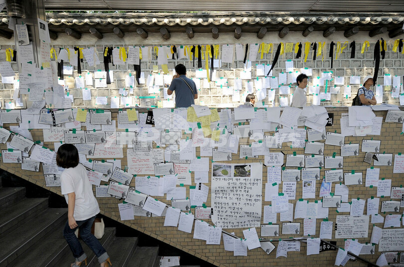 写真は、ソウル市内の壁一面に貼られた、盧・前大統領に向けた市民らのメッセージ(2009年5月27日撮影)。(c)AFP/JUNG YEON-JE