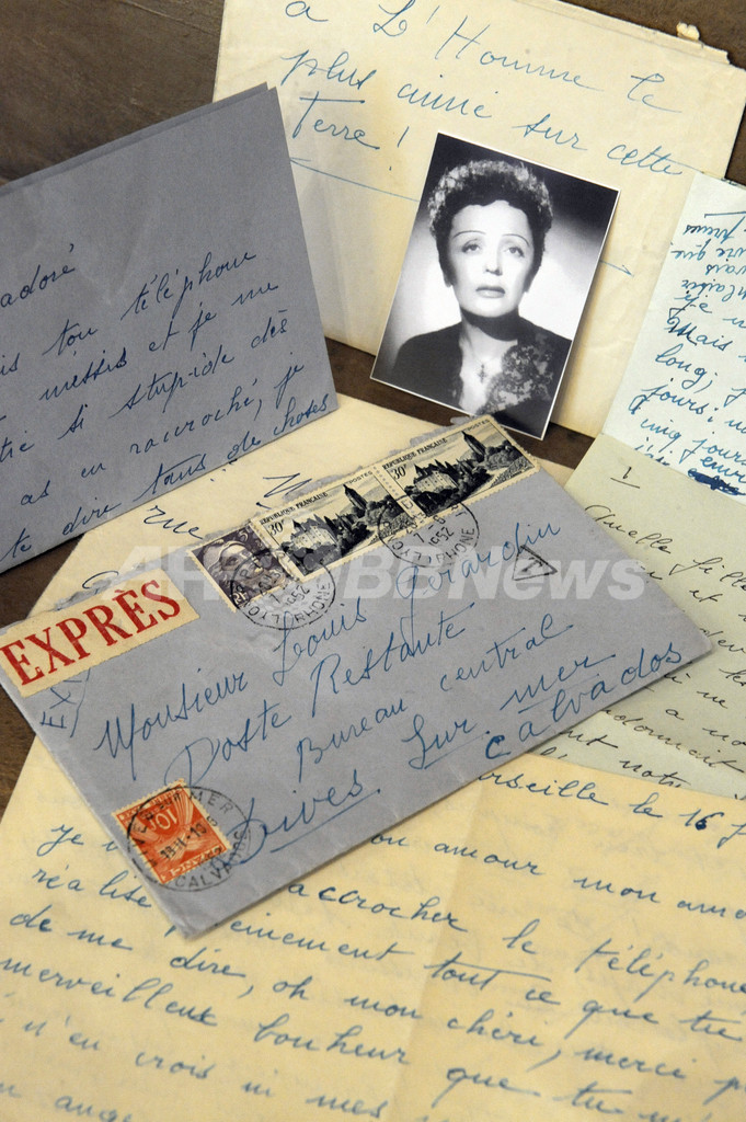 ピアフとジェラルダンの恋は、ピアフが1952年にフランス人俳優ジャック・ピルス(Jacques Pills)と結婚したことで終わっている。写真は、29日に公開されたこれらの手紙(2009年5月29日撮影)。(c)AFP