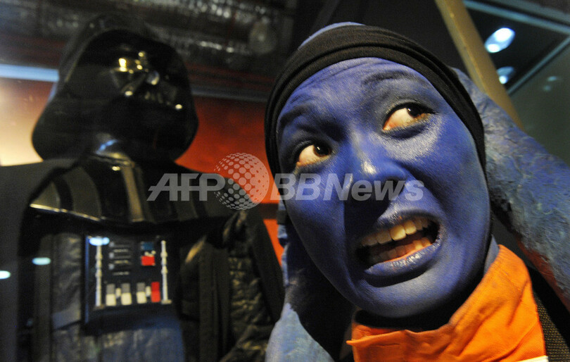 企画展は、ボストン科学博物館(Boston Museum of Science)が映画制作会社ルーカスフィルム(Lucasfilm)と共同製作した。写真は、ダースベーダー(Darth Vader)の前で不安そうな表情をしてみせるトゥイレック(Twi'lek)姿の女性(2009年6月2日撮影)。(c)AFP/William WEST