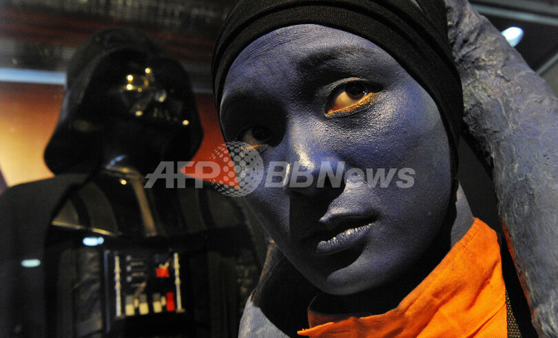 企画展は、ボストン科学博物館(Boston Museum of Science)が映画制作会社ルーカスフィルム(Lucasfilm)と共同製作した。写真は、ダースベーダー(Darth Vader)の前で不安そうな表情をしてみせるトゥイレック(Twi'lek)姿の女性(2009年6月2日撮影)。(c)AFP/William WEST