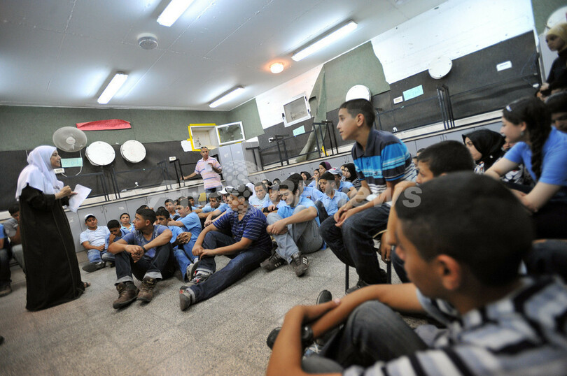 イスラエル全土で2日、市民による防衛訓練が行われた。シリアやイランからのミサイル攻撃、パレスチナ自治区ガザ地区(Gaza Strip)やレバノンからのロケット弾攻撃、自爆攻撃から自然災害までを想定したもので、サイレンが各地で鳴り響き、同国史上最大規模の訓練となった。写真は、Kfar Qassemの学校でシェルターに集まったアラブ系の教師と子供たち(2009年6月2日撮影)。(c)AFP/YEHUDA RAIZNER