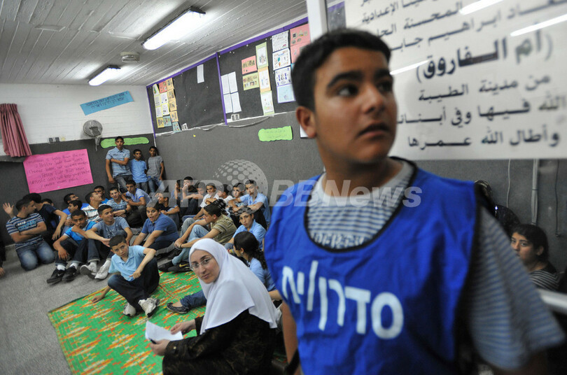 イスラエル全土で2日、市民による防衛訓練が行われた。シリアやイランからのミサイル攻撃、パレスチナ自治区ガザ地区(Gaza Strip)やレバノンからのロケット弾攻撃、自爆攻撃から自然災害までを想定したもので、サイレンが各地で鳴り響き、同国史上最大規模の訓練となった。写真は、Kfar Qassemの学校でシェルターに集まったアラブ系の教師と子供たち(2009年6月2日撮影)。(c)AFP/YEHUDA RAIZNER