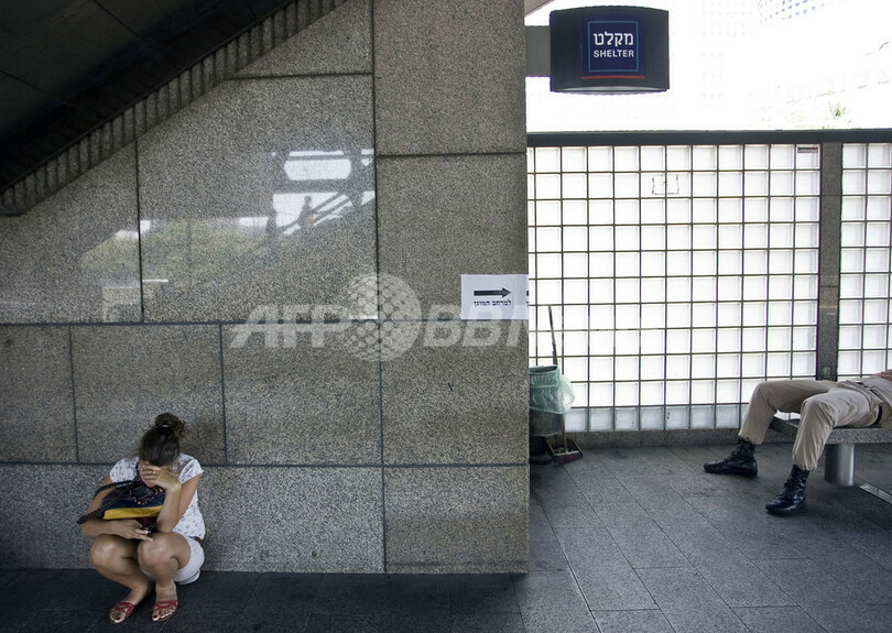 イスラエル全土で2日、市民による防衛訓練が行われた。シリアやイランからのミサイル攻撃、パレスチナ自治区ガザ地区(Gaza Strip)やレバノンからのロケット弾攻撃、自爆攻撃から自然災害までを想定したもので、サイレンが各地で鳴り響き、同国史上最大規模の訓練となった。写真は、テルアビブ(Tel Aviv)の訓練所でシェルターの外に座った人々(2009年6月2日撮影)。(c)AFP/JONATHAN NACKSTRAND