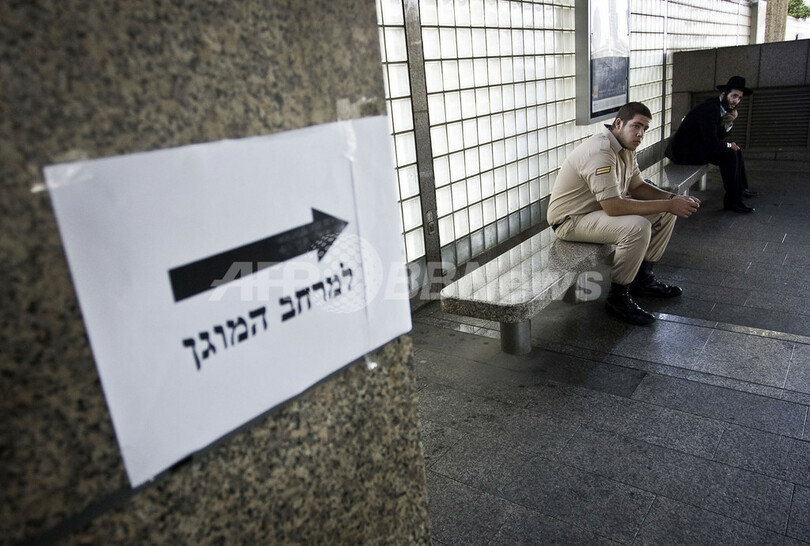 イスラエル全土で2日、市民による防衛訓練が行われた。シリアやイランからのミサイル攻撃、パレスチナ自治区ガザ地区(Gaza Strip)やレバノンからのロケット弾攻撃、自爆攻撃から自然災害までを想定したもので、サイレンが各地で鳴り響き、同国史上最大規模の訓練となった。写真は、テルアビブ(Tel Aviv)の訓練所でシェルターの外に座った人々(2009年6月2日撮影)。(c)AFP/JONATHAN NACKSTRAND