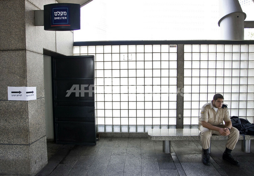 イスラエル全土で2日、市民による防衛訓練が行われた。シリアやイランからのミサイル攻撃、パレスチナ自治区ガザ地区(Gaza Strip)やレバノンからのロケット弾攻撃、自爆攻撃から自然災害までを想定したもので、サイレンが各地で鳴り響き、同国史上最大規模の訓練となった。写真は、テルアビブ(Tel Aviv)の訓練所でシェルターの外に座った兵士(2009年6月2日撮影)。(c)AFP/JONATHAN NACKSTRAND