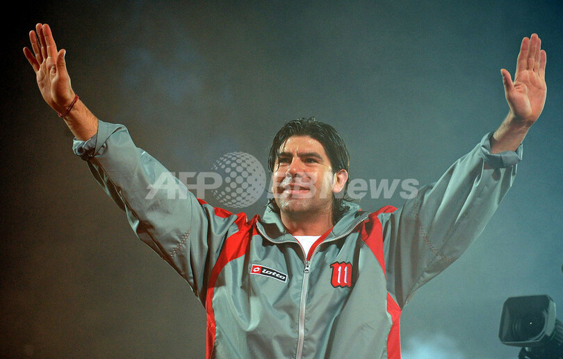 サッカー元チリ代表のマルセロ・サラス(%%Marcelo Salas%%)の引退記念試合が2日、サンティアゴ(Santiago)の国立スタジアム(Estadio Nacional de Chile)で開催された。エル・マタドール(El Matador、闘牛士)と呼ばれるサラスは、そのキャリアにおいて250得点近くを記録している。写真はファンの声援に応えるマルセロ・サラス。(2009年6月2日撮影)(c)AFP/MARTIN BERNETTI
