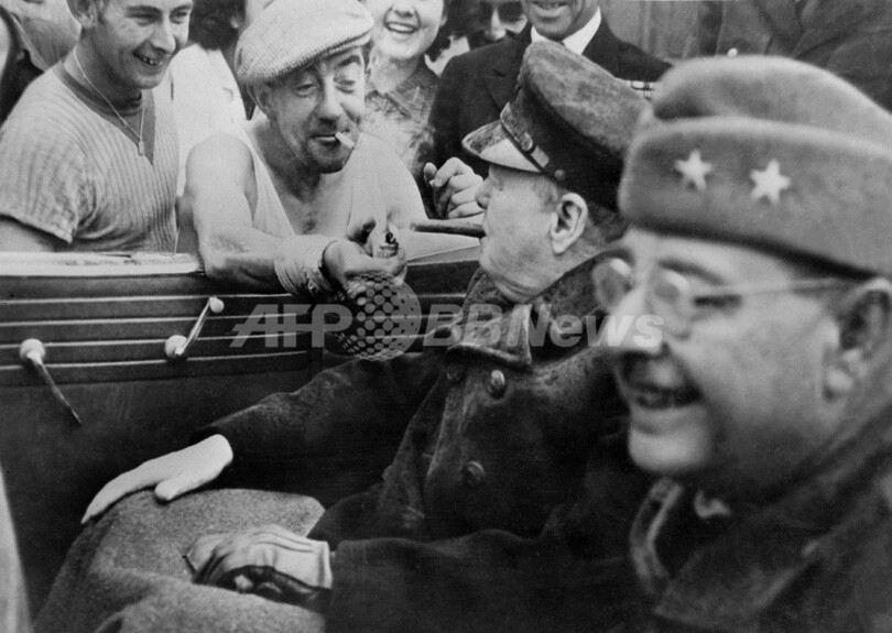写真は、1944年6月6日「Dデー(D-Day)」に仏西部ノルマンディー(Normandy)でノルマンディー上陸作戦が決行された後、フランス・シェルブール(Cherbourg)に到着したウィンストン・チャーチル(Winston Churchill)英首相にたばこの火を差し出す男性(1944年6月10日撮影)。(c)AFP