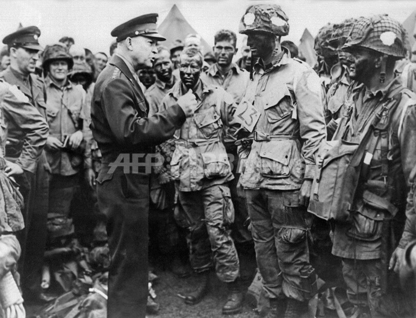 写真は、仏西部ノルマンディー(Normandy)でノルマンディー上陸作戦が決行された1944年6月6日「Dデー(D-Day)」に、英国で(場所詳細は不明)上陸作戦に参加する落下傘部隊の将兵に指示する連合軍最高司令官のドワイト・D・アイゼンハワー将軍(Dwight D. Eisenhower)(1944年6月6日撮影)。(c)AFP