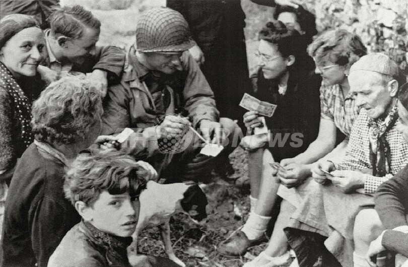 写真は、ノルマンディー上陸後、Colleville-Sur-Merの住民と会話する米兵(1944年6月6日撮影)。(c)AFP