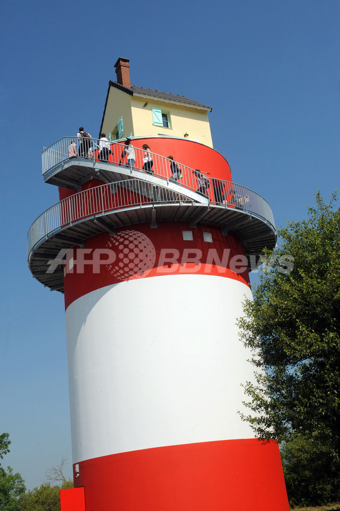 6月5日-8月16日に開催される現代アート展「Loire Estuary Project」に出展された、フランス北部コルドメ(Cordemais)に設けられた日本人アーティスト西野達(Tatzu Nishi)さんのインスタレーション「La villa cheminee(煙突の家)」。同展覧会では、ロワール川(River Loire)沿いのナント(Nantes)からサンナゼール(Saint-Nazaire)まで、約40マイル(約64キロ)に渡って作品が展示される(2009年6月4日撮影)。(c)AFP/FRANK PERRY