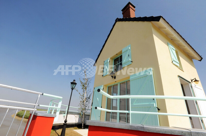 6月5日-8月16日に開催される現代アート展「Loire Estuary Project」に出展された、フランス北部コルドメ(Cordemais)に設けられた日本人アーティスト西野達(Tatzu Nishi)さんのインスタレーション「La villa cheminee(煙突の家)」。同展覧会では、ロワール川(River Loire)沿いのナント(Nantes)からサンナゼール(Saint-Nazaire)まで、約40マイル(約64キロ)に渡って作品が展示される(2009年6月4日撮影)。(c)AFP/FRANK PERRY