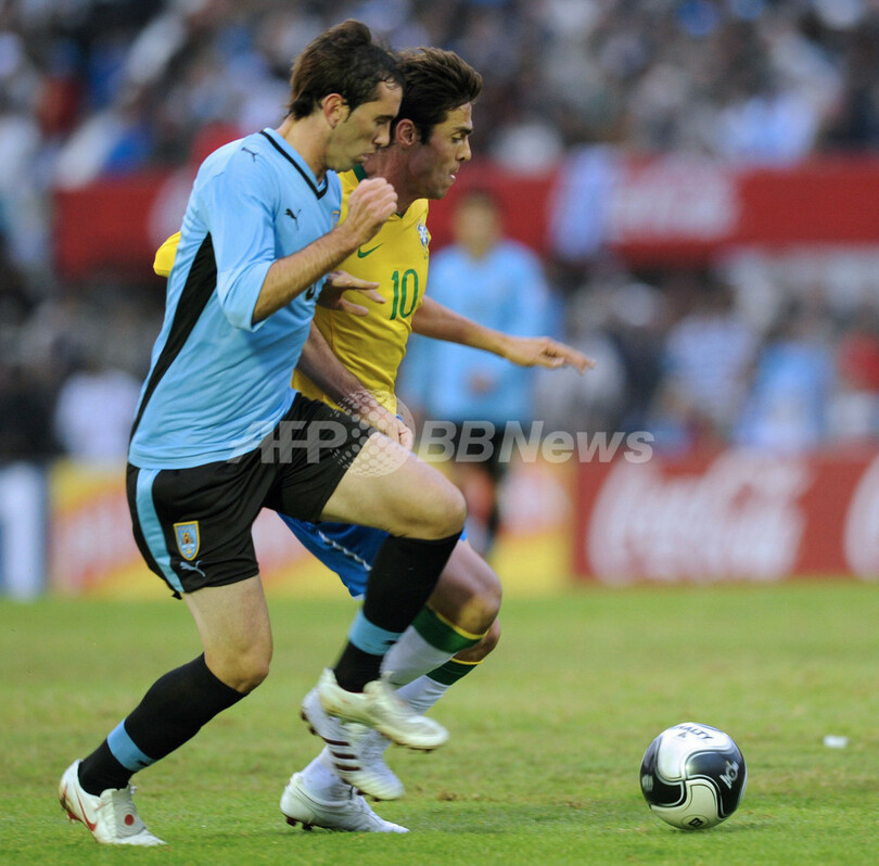 【6月7日 AFP】(記事更新、写真追加)2010年サッカーW杯南アフリカ大会(2010 World Cup)南米予選第13節、ウルグアイ対ブラジル。試合はブラジルが4-0で快勝した。第12節を終えて首位に立っていたパラグアイが同日行われた試合でチリに敗れたため、ブラジルが首位に立った。