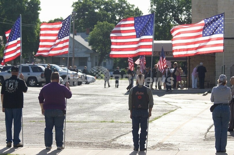 米カンザス(Kansas)州ウィチタ(Wichita)のルーテル教会で5月31日に殺害された産科医ジョージ・ティラー(George Tiller)さんの葬儀が6日、ウィチタのカレッジ・ヒル・ユナイテッド・メソジスト教会(College Hill United Methodist Church)で営まれた。ティラーさんは後期中絶を取り扱う全米で数少ないクリニックを経営していた。写真は葬儀が営まれている間、教会の前で抗議行動を行う米在郷軍人会(The American Legion)のメンバー。(2009年6月6日撮影)。(c)AFP/Getty Images/Kelly Glasscock