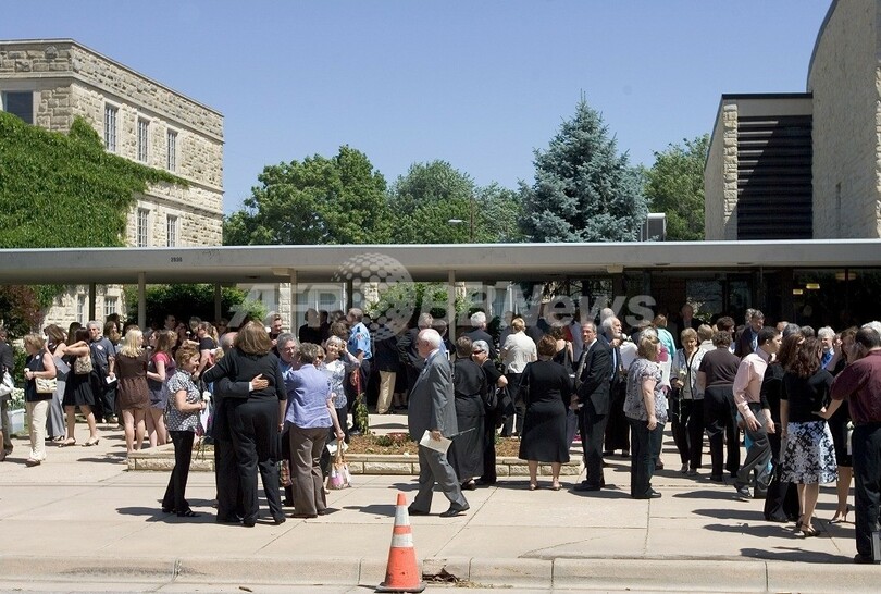 米カンザス(Kansas)州ウィチタ(Wichita)のルーテル教会で5月31日に殺害された産科医ジョージ・ティラー(George Tiller)さんの葬儀が6日、ウィチタのカレッジ・ヒル・ユナイテッド・メソジスト教会(College Hill United Methodist Church)で営まれた。ティラーさんは後期中絶を取り扱う全米で数少ないクリニックを経営していた。写真は葬儀を終えて教会を出た会葬者ら(2009年6月6日撮影)。(c)AFP/Getty Images/Kelly Glasscock