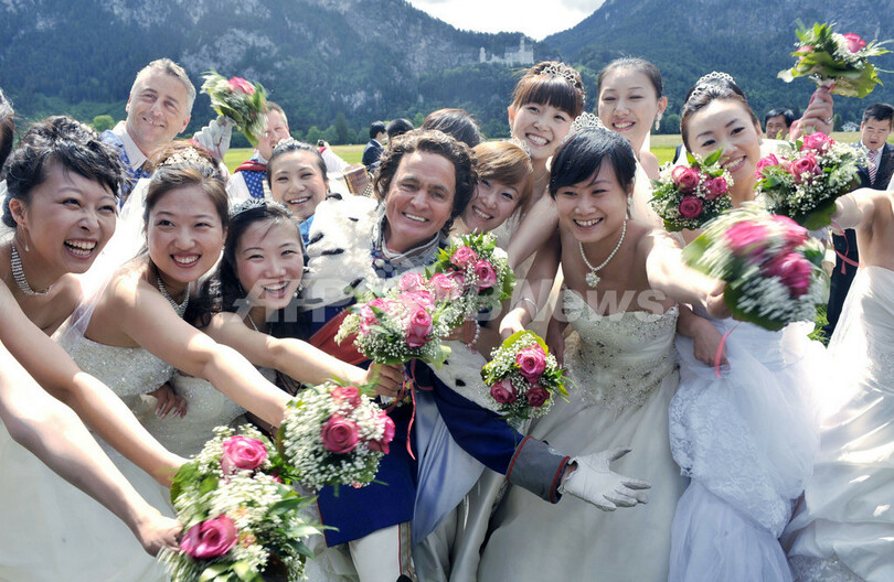 ドイツ南部フュッセン(Fuessen)の聖マング(St. Mang)教会で7日、中国から訪れた新婚カップル39組が集団結婚式を挙げた。幸せいっぱいの新郎新婦はその後、シュバンガウ(Schwangau)に向かい、ノイシュバンシュタイン城(Neuschwanstein Palace)を背に、地元の楽団に祝福されながらの記念撮影に臨んだ。写真は、ルートビヒ2世(Ludwig II)に扮(ふん)した男性を囲んで記念撮影に臨む中国人花嫁たち(2009年6月7日撮影)。(c)AFP/DDP/OLIVER LANG