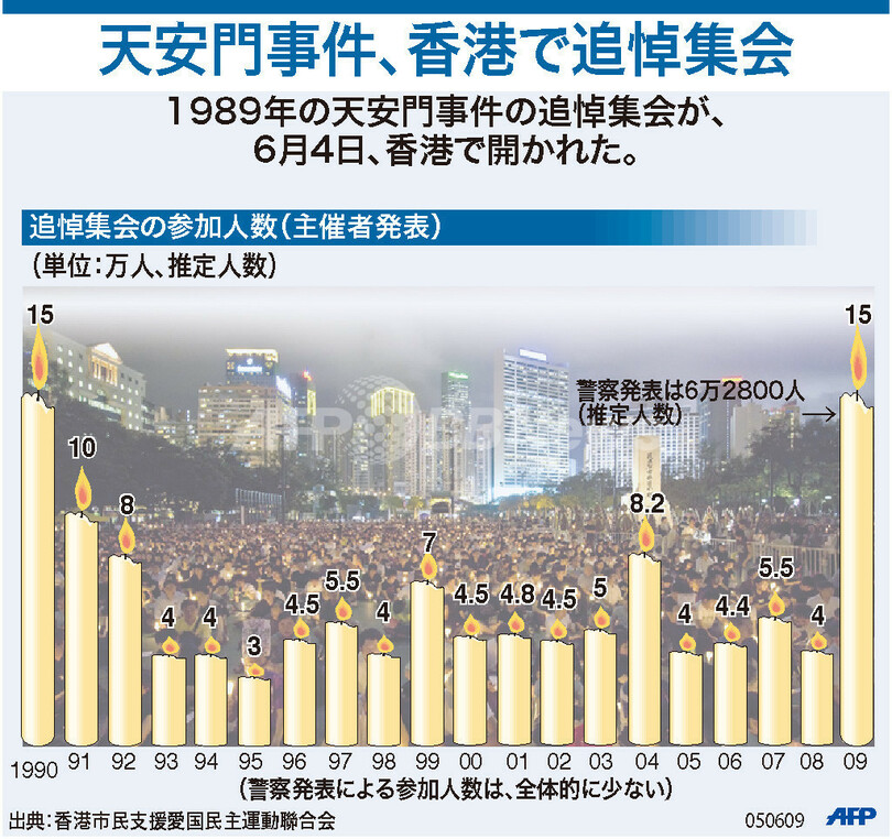 ニュース 政治・経済 図解 【図解】天安門事件の追悼集会、参加人数の推移 香港 2009年6月8日 20:30 発信地:その他 [ 例外 その他 ] このニュースをシェア (c)AFP 【6月8日 AFP】図は、毎年6月4日に香港で開かれる1989年に起きた天安門事件の追悼集会における参加人数を示したもの。(c)AFP<ニュース解説画像一覧へ> 政治・経済 一覧へ> メディア・報道関係・法人の方向け 写真・動画 購入のお問合せ>
