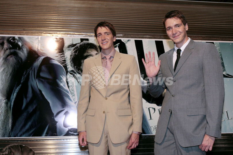 フランス・パリ(Paris)のパリ北駅に8日、ハリー・ポッター(Harry Potter)列車が出現し、映画シリーズ最新作『ハリー・ポッターと謎のプリンス(Harry Potter and the Half-Blood Prince)』の出演者らとともにフォトコールが行われた。この列車は、ワーナー・ブラザーズ(Warner Brothers)が用意したもので、21日までフランス国内10都市をめぐり、最新作のプロモーションを行う。写真は、ハリー・ポッター列車をバックにポーズを取るオリバー・フェルプス(Oliver Phelps、左)とジェームス・フェルプス(James Phelps、2009年6月8日撮影)。(c)AFP/FRANCOIS GUILLOT