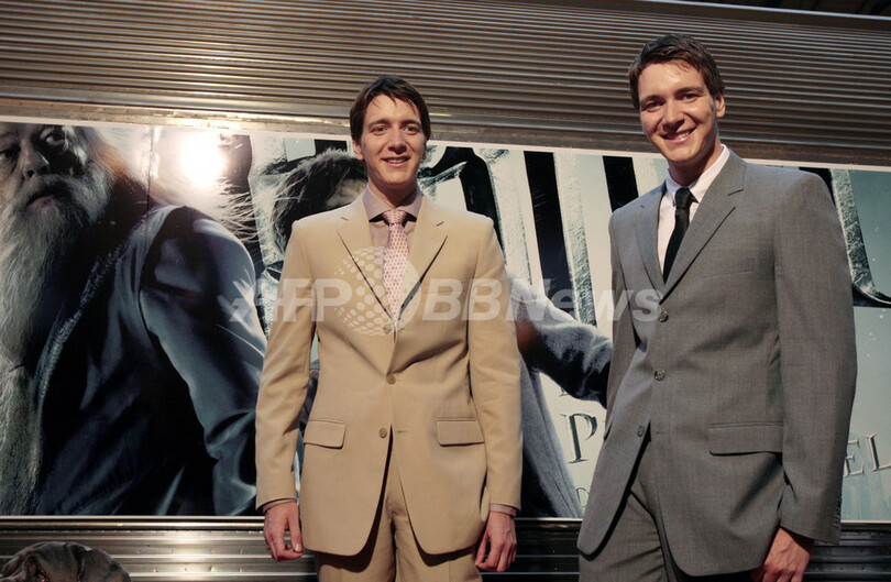 フランス・パリ(Paris)のパリ北駅に8日、ハリー・ポッター(Harry Potter)列車が出現し、映画シリーズ最新作『ハリー・ポッターと謎のプリンス(Harry Potter and the Half-Blood Prince)』の出演者らとともにフォトコールが行われた。この列車は、ワーナー・ブラザーズ(Warner Brothers)が用意したもので、21日までフランス国内10都市をめぐり、最新作のプロモーションを行う。写真は、ハリー・ポッター列車をバックにポーズを取るオリバー・フェルプス(Oliver Phelps、左)とジェームス・フェルプス(James Phelps、2009年6月8日撮影)。(c)AFP/FRANCOIS GUILLOT