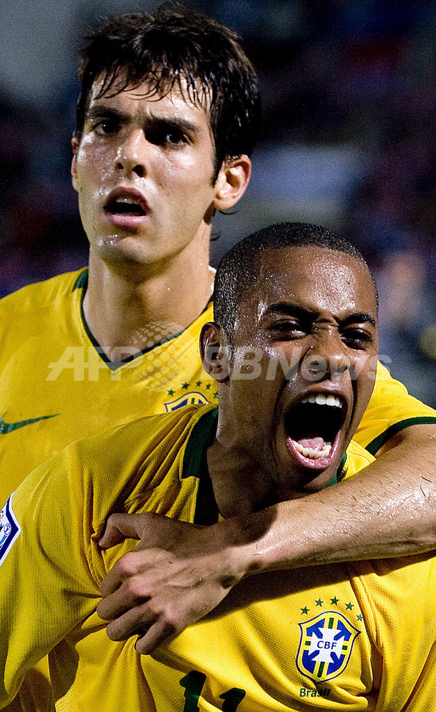 2010年サッカーW杯南アフリカ大会(%%2010 World Cup%%)南米予選第14節、ブラジル対パラグアイ。試合は前半25分にエラーノ(%%Elano%%)のオウンゴールでパラグアイが先制するも、同40分にロビーニョ(%%Robinho%%)、後半4分にニウマール(%%Honorato da Silva Nilmar%%)が得点を挙げたブラジルが2-1で勝利を収めた。写真は前半40分に同点ゴールを決めてチームメイトのカカ(%%Kaka%%、左)と共に歓喜するブラジルのロビーニョ(右)。(2009年6月10日撮影)(c)AFP/ANTONIO SCORZA