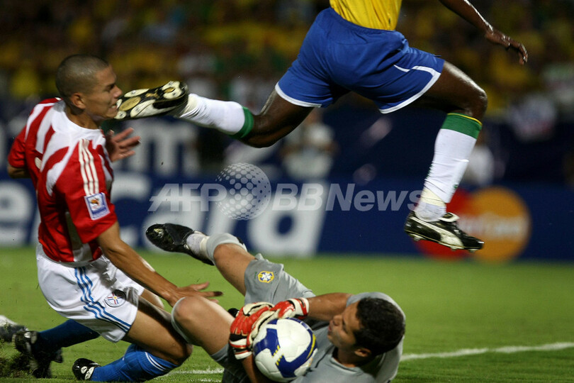 2010年サッカーW杯南アフリカ大会(%%2010 World Cup%%)南米予選第14節、ブラジル対パラグアイ。試合は前半25分にエラーノ(%%Elano%%)のオウンゴールでパラグアイが先制するも、同40分にロビーニョ(%%Robinho%%)、後半4分にニウマール(%%Honorato da Silva Nilmar%%)が得点を挙げたブラジルが2-1で勝利を収めた。写真はパラグアイのダリオ・ベロン(%%Dario Veron%%)の得点機を阻むブラジルのGKジュリオ・セザール(%%Julio Cesar%%)。(2009年6月10日撮影)(c)AFP/Mauricio LIMA