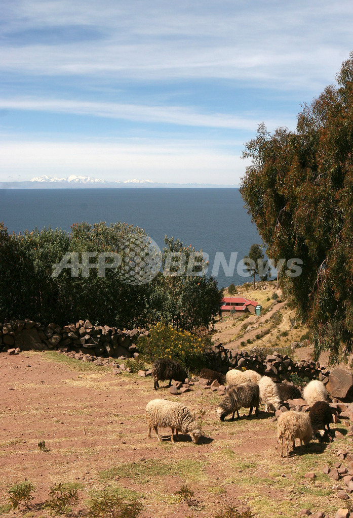 写真は、タキーレ島の斜面で草を食べる羊の群れ(2009年5月30日撮影)。(c)AFP/Jaime Razuri