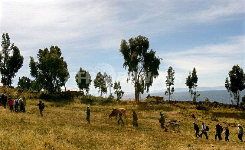 写真は、タキーレ島の草地を横切る観光客ら(2009年5月30日撮影)。(c)AFP/Jaime Razuri