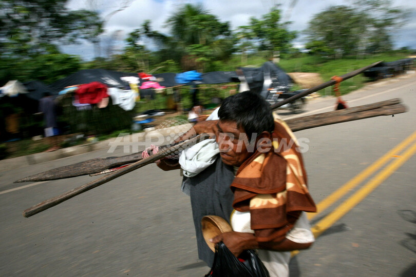 ふたつの法案はペルーの熱帯雨林に住む65の先住民族、約50万人の圧倒的な反対に直面した。先住民たちは、ジャングル開発は自分たちの生活様式に対する攻撃だとみなし、4月以降アマゾン地域一帯で抗議行動を展開していた。(c)AFP/Philippe Bernes-Lasserre