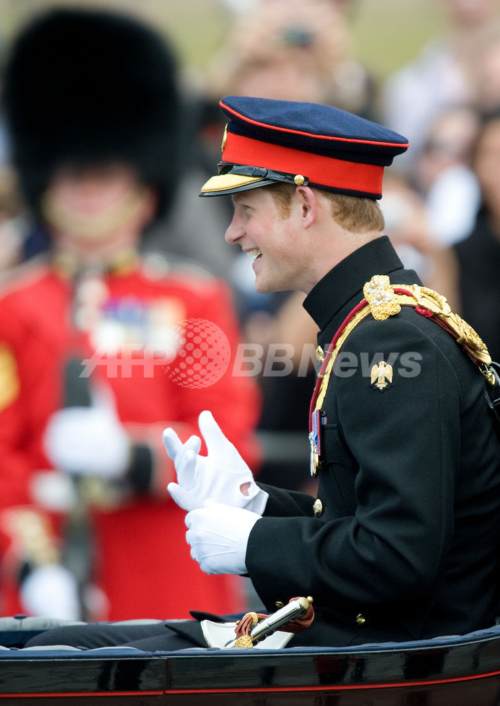 英国は13日、エリザベス女王(Queen Elizabeth II)の83歳の公式誕生日を迎え、祝賀行事が行われた。エリザベス女王の本当の誕生日は4月21日だが、戸外での祝賀行事に適した天候になる6月第2土曜日を公式誕生日として祝賀行事が行われる。写真は、英女王の公式誕生日のパレード「Trooping the Colour」のためバッキンガム宮殿(Buckingham Palace)を出るヘンリー王子(Prince Harry、2009年6月13日撮影)。(c)AFP/Leon Neal