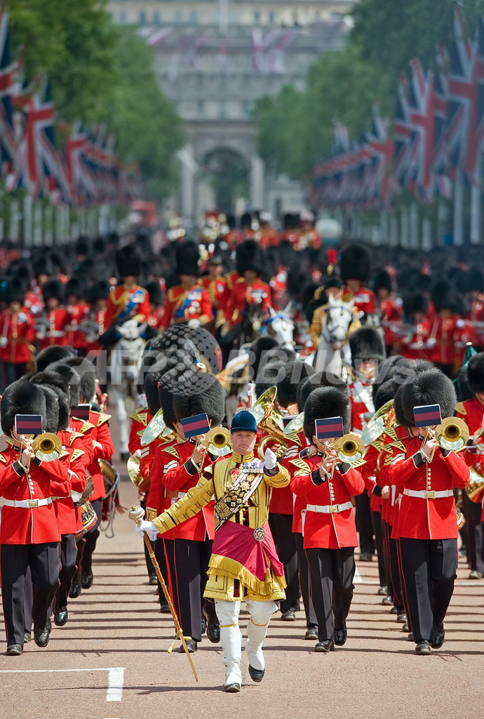 英国は13日、エリザベス女王(Queen Elizabeth II)の83歳の公式誕生日を迎え、祝賀行事が行われた。エリザベス女王の本当の誕生日は4月21日だが、戸外での祝賀行事に適した天候になる6月第2土曜日を公式誕生日として祝賀行事が行われる。写真は、英女王の公式誕生日のパレード「Trooping the Colour」の後にトラファルガー広場(Trafalgar Square)とバッキンガム宮殿(Buckingham Palace)を結ぶ道路、ザ・マル(The Mall)をパレードする近衛ウェールズ連隊(Welsh Guards)の軍楽隊(2009年6月13日撮影)。(c)AFP/Leon Neal
