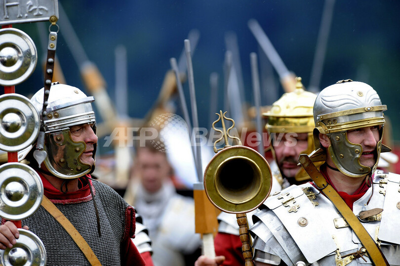 写真は、「トイトブルク森の戦い」の再現イベントでローマ帝国軍兵士に扮(ふん)した人びと(2009年6月11日撮影)。(c)AFP/DDP/DAVID HECKER
