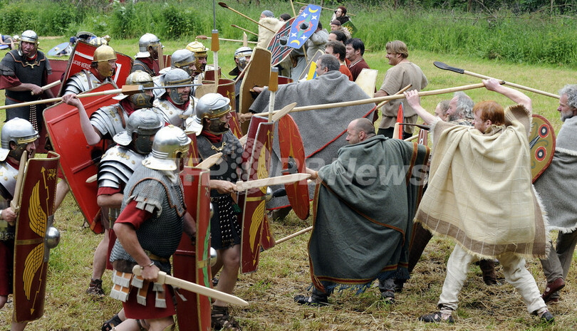 写真は、ローマ帝国軍兵士とゲルマン人兵士に扮(ふん)し「トイトブルク森の戦い」に参加する人びと(2009年6月11日撮影)。(c)AFP/DDP/DAVID HECKER