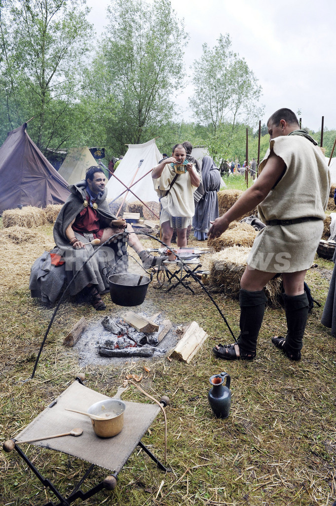 写真は、「トイトブルク森の戦い」の再現イベントで、陣地内で料理するゲルマン人兵士役の参加者(2009年6月11日撮影)。(c)AFP/DDP/DAVID HECKER