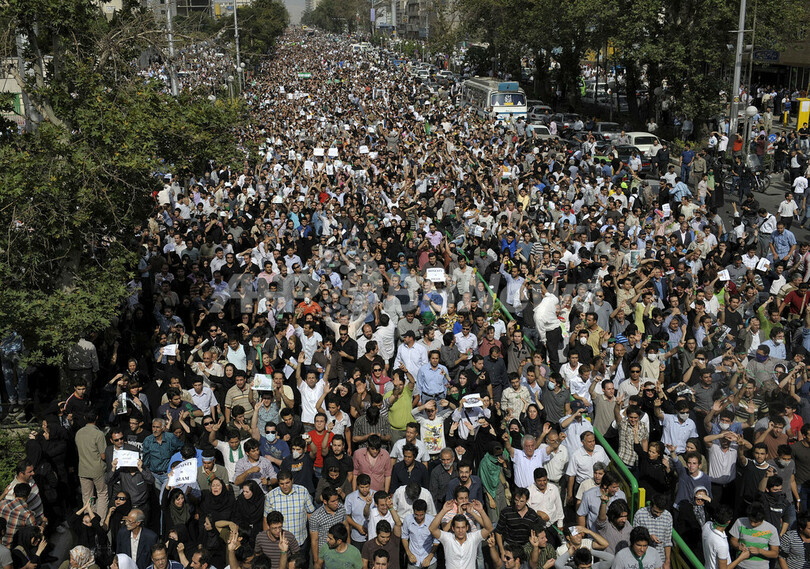 12日のイラン大統領選は、マフムード・アフマディネジャド(Mahmoud Ahmadinejad)大統領が得票率63%で再選し、対立候補のミルホセイン・ムサビ(Mir Hossein Mousavi)元首相は34%の得票率となったと発表されている。(c)AFP
