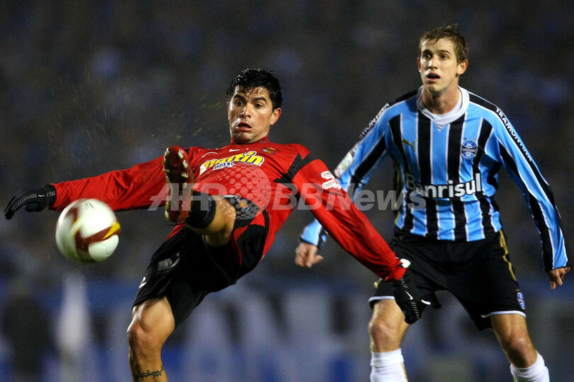 サッカーリベルタドーレス杯2009(%%Copa Libertadores de America 2009%%)準々決勝、グレミオ(%%Gremio%%、ブラジル)対カラカス(%%Caracas FC%%、ベネズエラ)第2戦。試合は0-0の引き分けに終わり、2戦合計1-1となったが、アウェーゴール規定によりグレミオが準決勝に進出した。写真はグレミオのアジウソン(%%Adilson Warken%%、右)の前でボールをコントロールするカラカスのフランクリン・ルセナ(%%Franklin Lucena%%)。(2009年6月17日撮影)(c)AFP/JEFFERSON BERNARDES