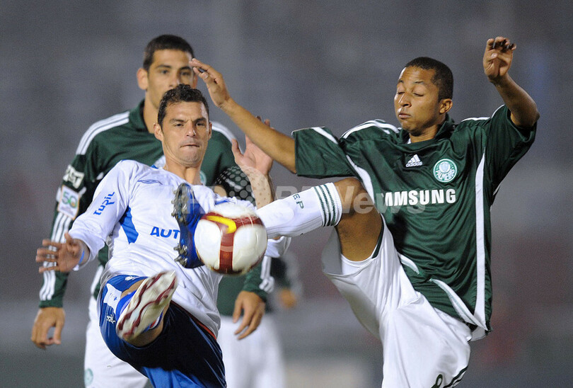 サッカーリベルタドーレス杯2009(%%Copa Libertadores de America 2009%%)準々決勝、ナシオナル・モンテビデオ(%%Nacional Montevideo%%、ウルグアイ)対パルメイラス(%%Palmeiras%%、ブラジル)第2戦。試合は0-0の引き分けに終わり、2試合合計1-1-となったがアウェーゴール規定によりナシオナル・モンテビデオが準決勝に進んだ。写真はパルメイラスのウィリアンス・ドス・サントス(%%Willians Dos Santos%%、右)とボールを競るナシオナル・モンテビデオのアドリアン・ロメロ(%%Adrian Romero%%)。(2009年6月17日撮影)(c)AFP/MIGUEL ROJO