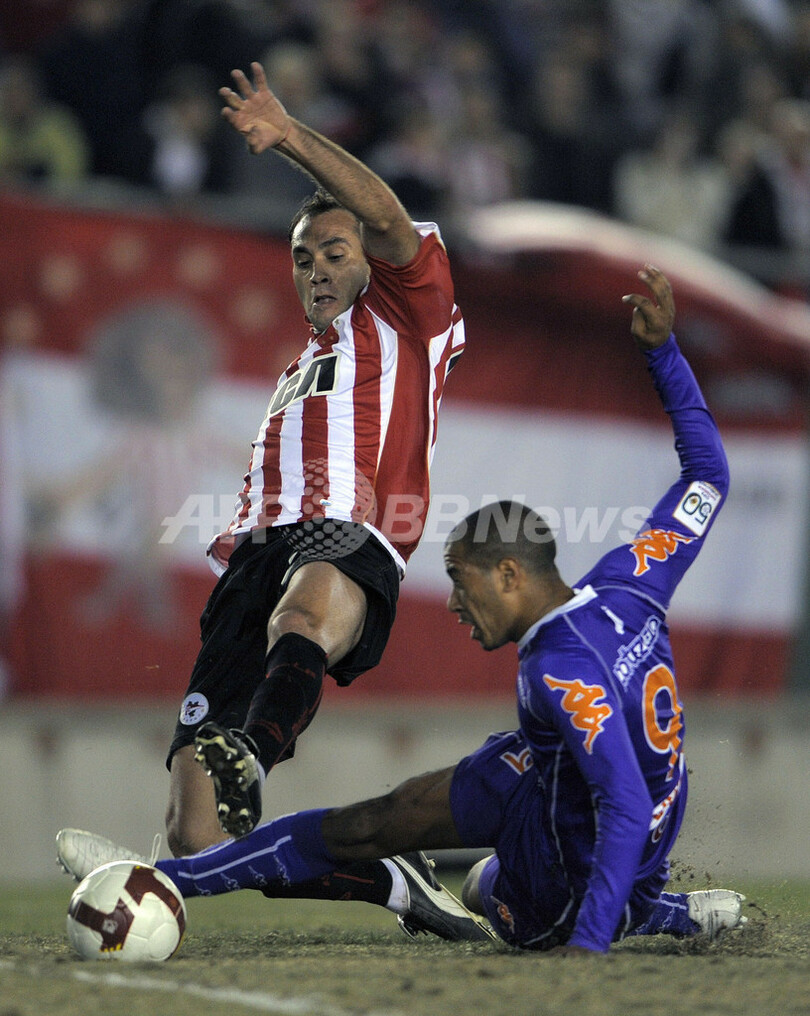 サッカーリベルタドーレス杯2009(%%Copa Libertadores de America 2009%%)準々決勝、エストゥディアンテス(%%Estudiantes%%、アルゼンチン)対デフェンソール・スポルティング(%%Defensor Sporting%%、ウルグアイ)第2戦。試合はエストゥディアンテスが1-0で勝利し、2試合合計スコアを2-0として準決勝に進出した。写真はディエゴ・ヴェラ(%%Diego Vera%%)からスライディングを受けるエストゥディアンテスのレアンドロ・デサバト(%%Leandro Desabato%%)。(2009年6月18日撮影)(c)AFP/JUAN MABROMATA