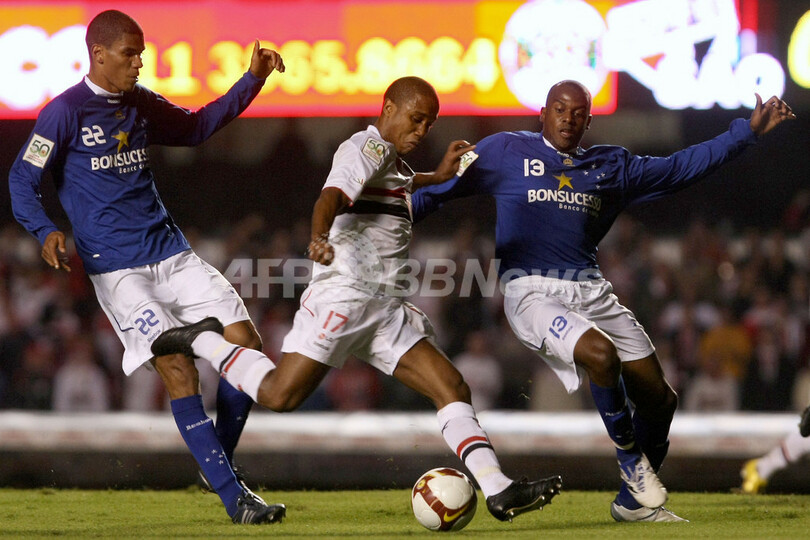 サッカーリベルタドーレス杯2009(%%Copa Libertadores de America 2009%%)準々決勝、サンパウロFC(%%Sao Paulo FC%%、ブラジル)対クルゼイロEC(%%Cruzeiro EC%%、ブラジル)第2戦。試合はクルゼイロが2-0で勝利し、2試合合計スコアを4-1として準決勝に進出した。写真はディフェンスに囲まれるサンパウロのボルジェス(%%Humberlito Borges Teixeira 'Borges'%%、中央)。(2009年6月18日撮影)(c)AFP/MAURICIO LIMA