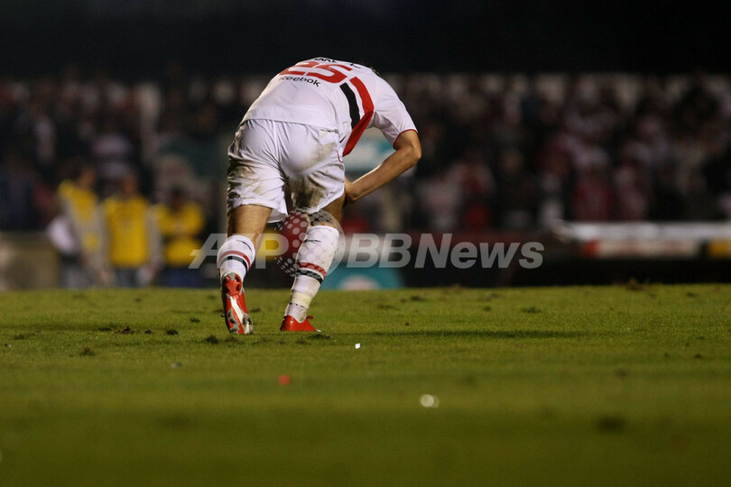 サッカーリベルタドーレス杯2009(%%Copa Libertadores de America 2009%%)準々決勝、サンパウロFC(%%Sao Paulo FC%%、ブラジル)対クルゼイロEC(%%Cruzeiro EC%%、ブラジル)第2戦。試合はクルゼイロが2-0で勝利し、2試合合計スコアを4-1として準決勝に進出した。写真はひざを押さえるサンパウロのダゴベルト・ペレンティエル(%%Dagoberto Pelentier%%)。(2009年6月18日撮影)(c)AFP/MAURICIO LIMA