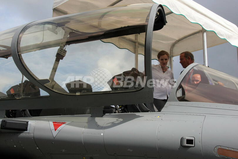 仏パリ(Paris)郊外のルブルジェ(Le Bourget)で開催中の第48回パリ国際航空ショー(Paris International Air Show)は19日、一般公開が始まり、一般の来場者も最新戦闘機を間近で見学したり、デモ飛行を見物したりした。一般公開は最終日の21日まで続く。写真は、仏ダッソー(Dassault)のラファール(Rafale)戦闘機のコックピットを見ながら、同社のシャルル・エデルステン(Charles Edelstenne)CEO(右)から説明を受けるナタリー・コシウスコ・モリゼ(Nathalie Kosciusko-Morizet)デジタル経済開発担当相(2009年6月19日撮影)。(c)AFP/PIERRE VERDY