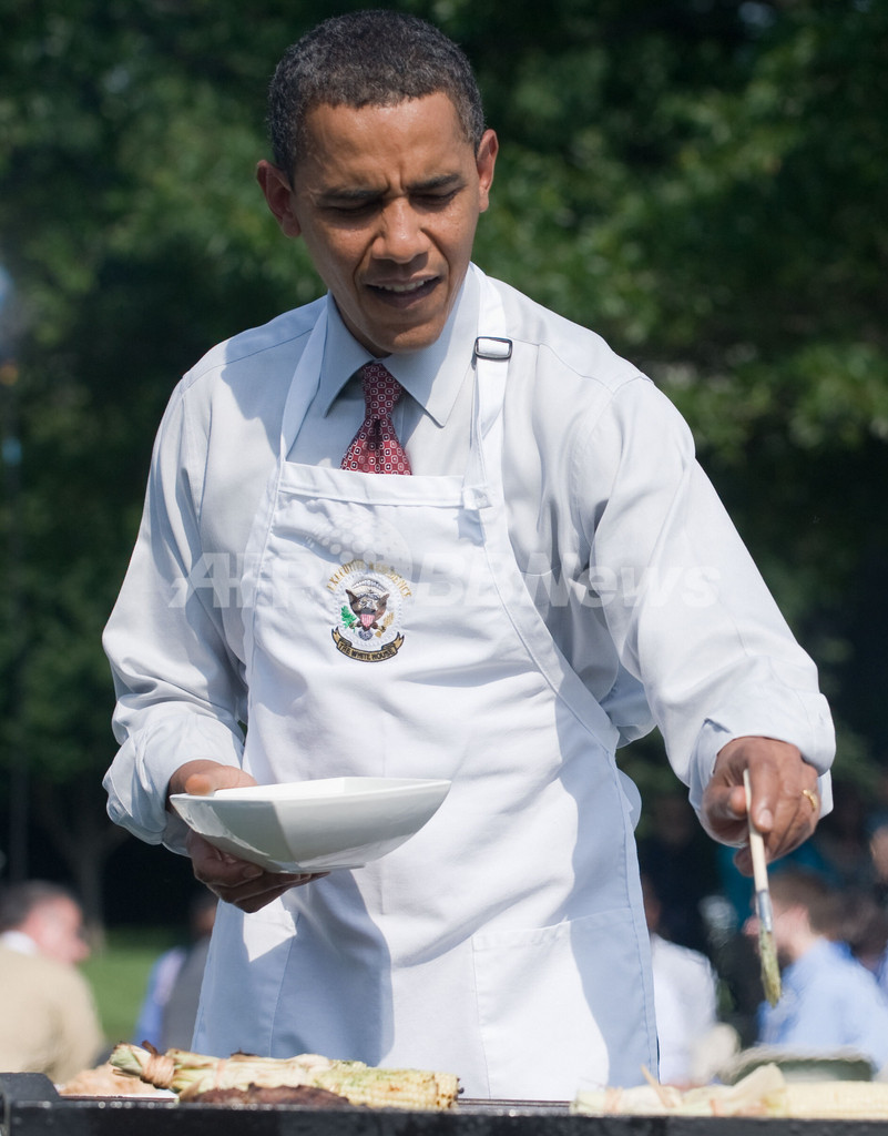 ホワイトハウス(White House)のサウスローン(South Lawn)で19日、父の日のイベントでバーべーキューをするバラク・オバマ(Barack Obama)大統領(2009年6月19日撮影)。(c)AFP/Saul LOEB