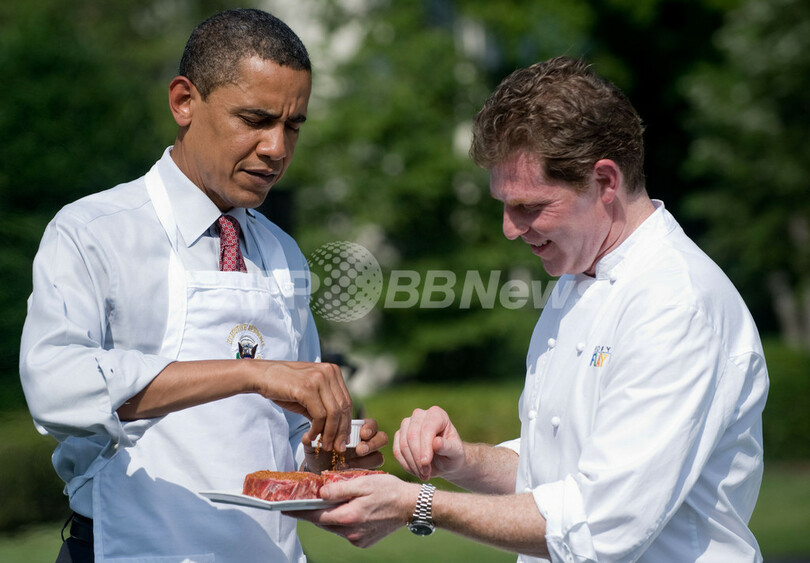 ホワイトハウス(White House)のサウスローン(South Lawn)で19日、父の日のイベントでバーべーキューをするバラク・オバマ(Barack Obama)大統領(2009年6月19日撮影)。(c)AFP/Saul LOEB