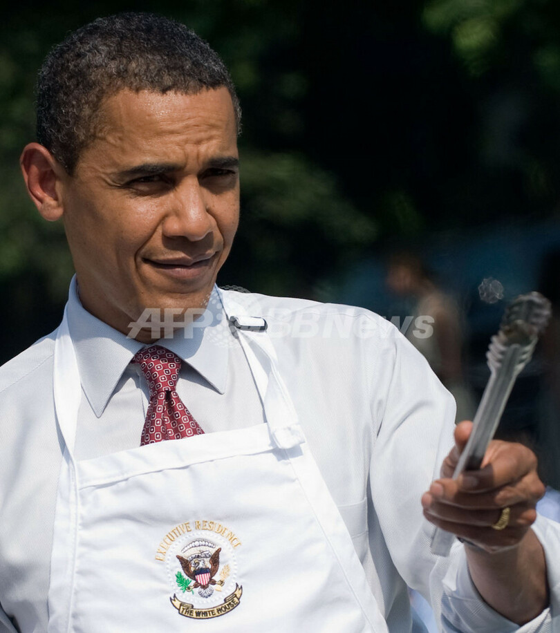 ホワイトハウス(White House)のサウスローン(South Lawn)で19日、父の日のイベントでバーべーキューをするバラク・オバマ(Barack Obama)大統領(2009年6月19日撮影)。(c)AFP/Saul LOEB