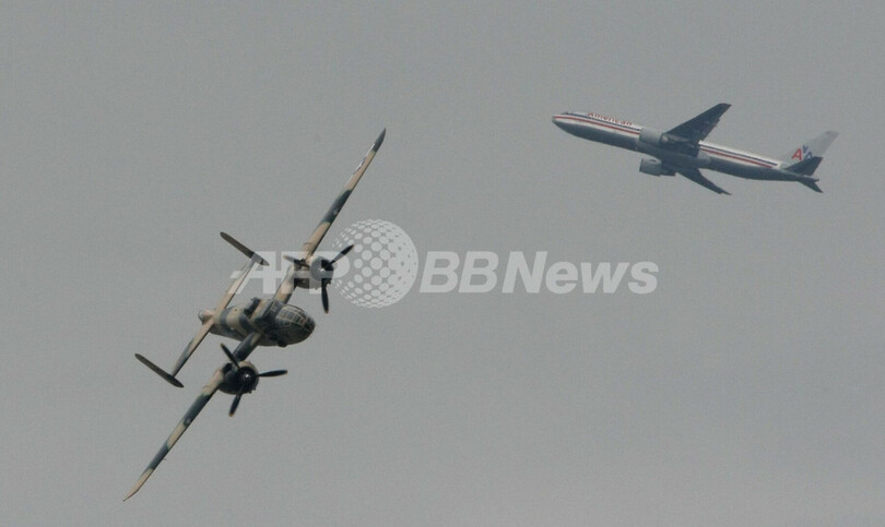 仏パリ(Paris)郊外のルブルジェ(Le Bourget)で開催中の第48回パリ国際航空ショー(Paris International Air Show)は6日目の20日、フランス空軍のアクロバットチーム、パトルイユ・ド・フランス(Patrouille de France)の展示飛行などが行われた。ニコラ・サルコジ(Nicolas Sarkozy)大統領も会場を訪れた。写真は、ジェット旅客機を背景にデモ飛行するノースアメリカン(North American)製B-25ミッチェル(Mitchell 、2009年6月20日撮影)。(c)AFP/PIERRE VERDY