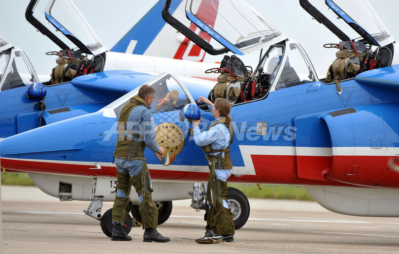 仏パリ(Paris)郊外のルブルジェ(Le Bourget)で開催中の第48回パリ国際航空ショー(Paris International Air Show)は6日目の20日、フランス空軍のアクロバットチーム、パトルイユ・ド・フランス(Patrouille de France)の展示飛行などが行われた。ニコラ・サルコジ(Nicolas Sarkozy)大統領も会場を訪れた。写真は、会場に到着し、機体から降りてチームメイトと言葉を交わすパトルイユ・ド・フランスのリーダー、ビルジニー・ギヨー(Virginie Guyot)少佐(中央、2009年6月20日撮影)。(c)AFP/ERIC PIERMONT