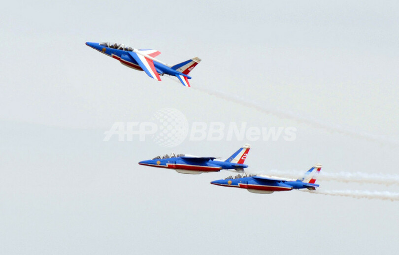 仏パリ(Paris)郊外のルブルジェ(Le Bourget)で開催中の第48回パリ国際航空ショー(Paris International Air Show)は6日目の20日、フランス空軍のアクロバットチーム、パトルイユ・ド・フランス(Patrouille de France)の展示飛行などが行われた。ニコラ・サルコジ(Nicolas Sarkozy)大統領も会場を訪れた。写真は、会場に着陸する態勢に入るパトルイユ・ド・フランスのリーダー、ビルジニー・ギヨー(Virginie Guyot)少佐の搭乗機(一番上、2009年6月20日撮影)。(c)AFP/ERIC PIERMONT